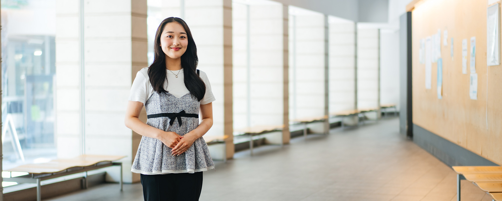 家族旅行をきっかけに航空会社の客室乗務員を目指した古畑璃沙さんは、英語やコミュニケーションに関する学びを深めました。卒業後は夢を叶え、客室乗務員として日本のおもてなしを世界に伝えます。青学での学びや就職活動で心がけたことについてお話を伺いました。