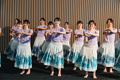 成長による体型変化でクラシックバレエが思うようにできなくなり、バレエに代わる新しい舞踊を探していて出会ったのがフラダンス(フラ)です。大学生活では、勉学とともに、「フラサークルUluwehi愛好会」(ウルヴェヒ)での活動にも力を入れてきました。