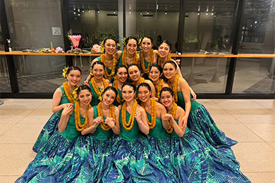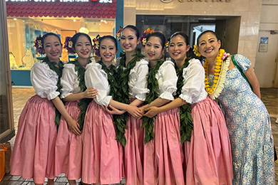 カレッジフラコンペティションで優勝した際、副賞としていただいたホテルの宿泊券を活用してハワイへ。アラモアナショッピングセンターのステージで踊った。左から3番目が松原さん