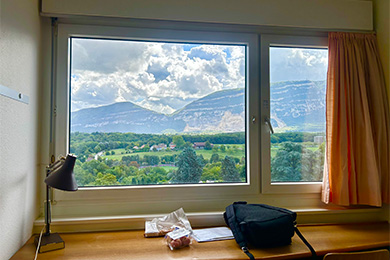 寮の部屋に到着して最初に目に飛び込んできたのは、窓一面に広がるサレーブ山の景色。その美しさに思わず撮影した、思い出の一枚