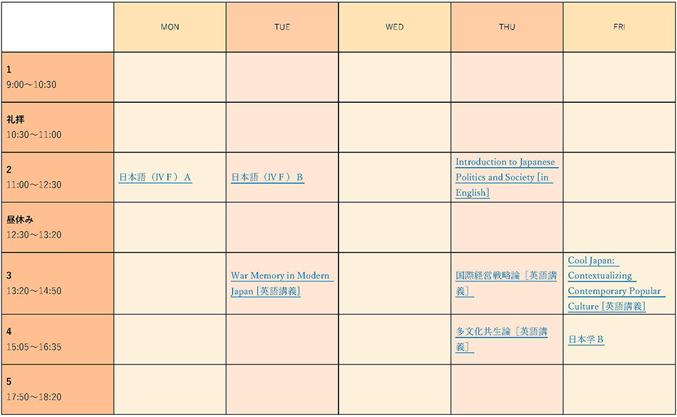 | MON | 2 11:00〜12:30 | 日本語(ⅣF)A |