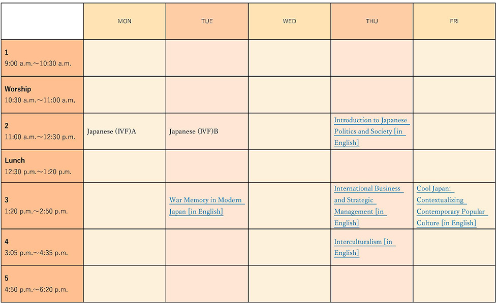 | MON | 2 11:00 a.m.〜12:30 p.m. | Japanese(ⅣF)A |